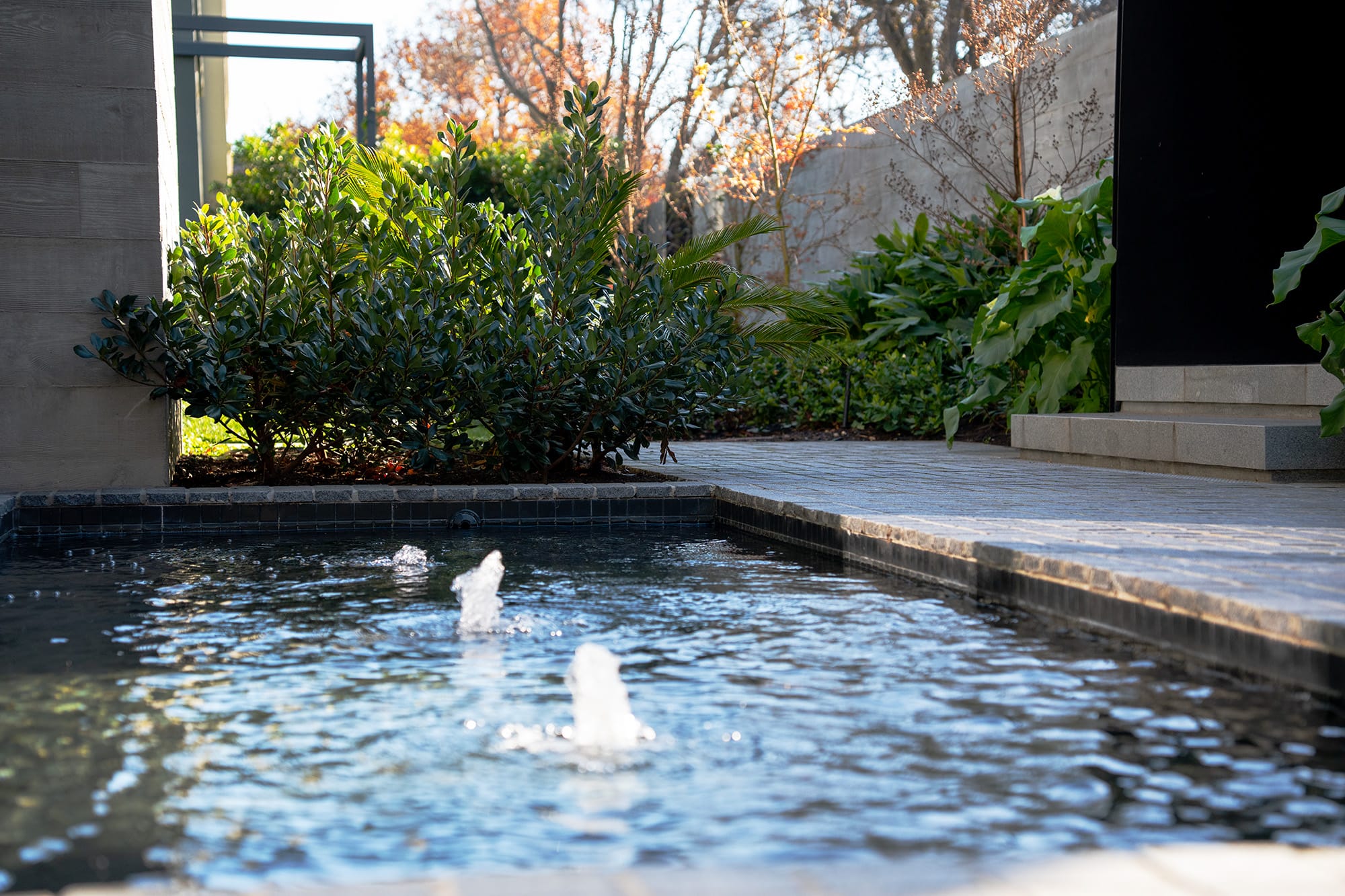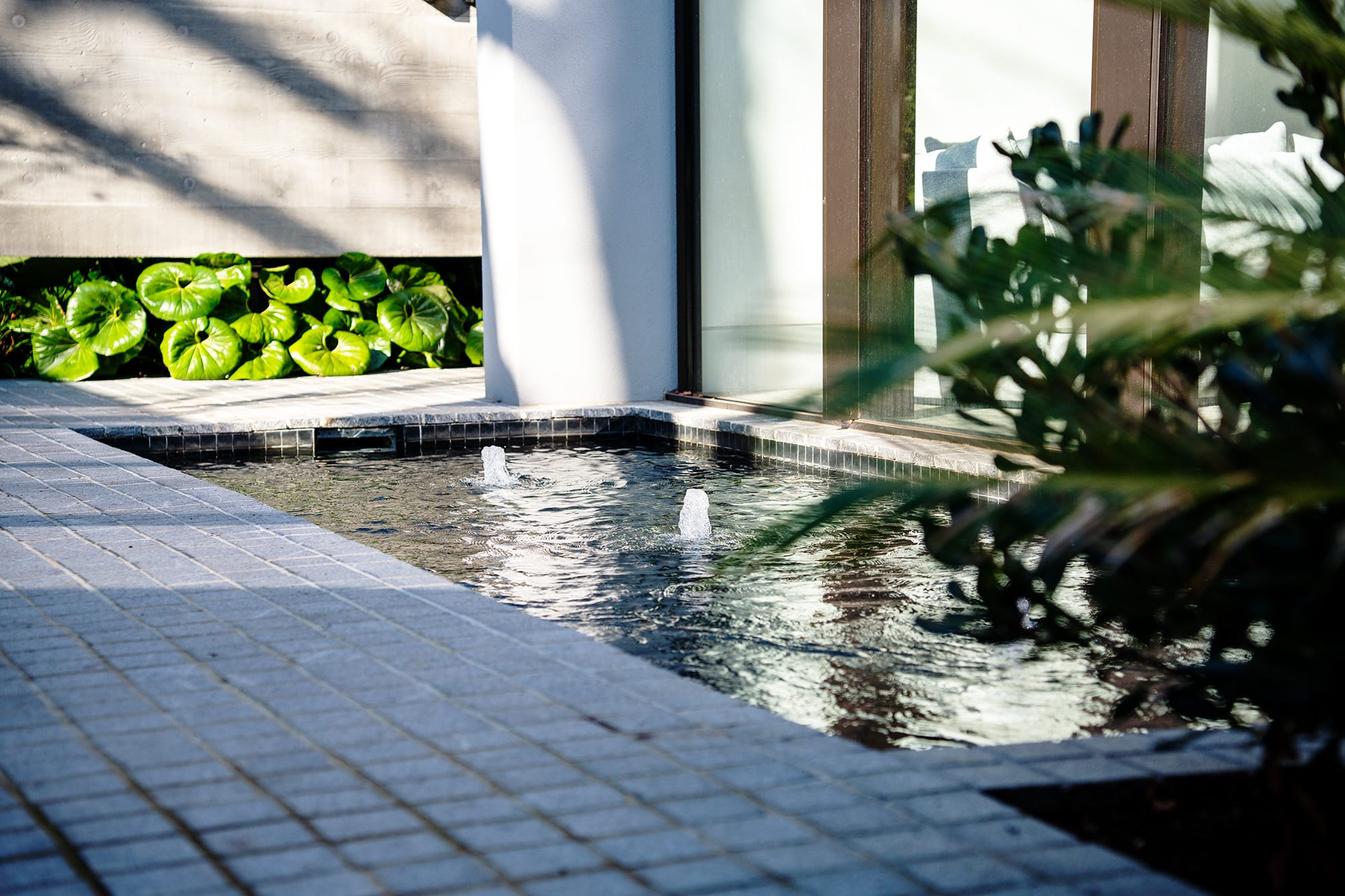 As you approach, the gentle sound of three central bubblers catches your attention and guides your gaze straight to the heart of the home. The black ceramic mosaic tiles beneath shimmer like liquid glass, capturing the mood of the day—whether it’s blue skies or a moody drizzle, Mother Nature’s reflection steals the spotlight.